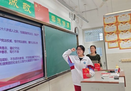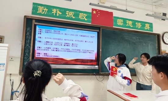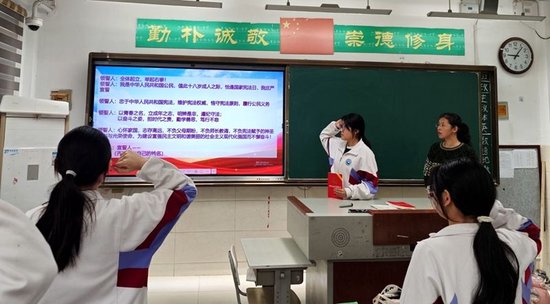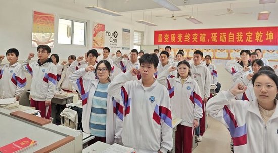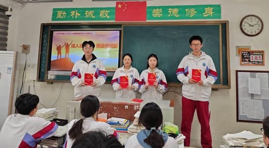 在高三政治教师的精心组织下,高三学生身着整洁校服,手持《中华人民共和国宪法》,在领誓人的带领下,齐声庄严宣誓。誓言铿锵有力,既饱含对宪法的尊崇、对公民义务的坚守,也抒发了成年后肩负时代使命的决心。