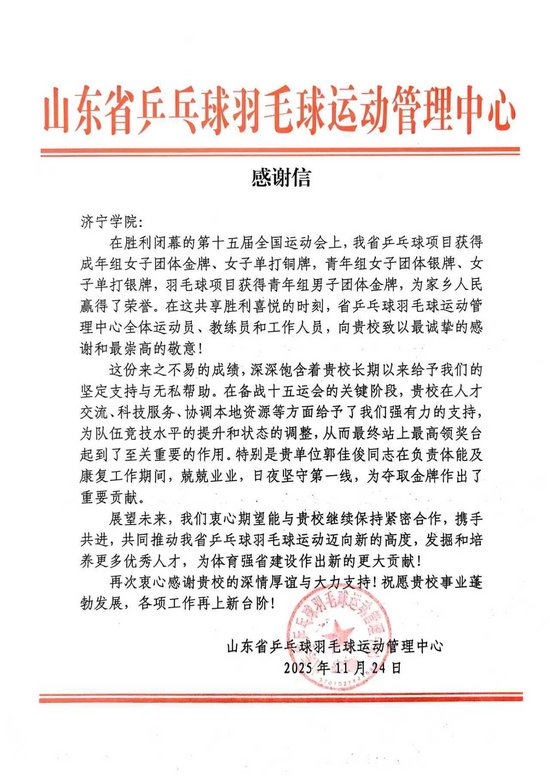 山东省乒羽运动管理中心致信感谢济宁学院助力十五运备战