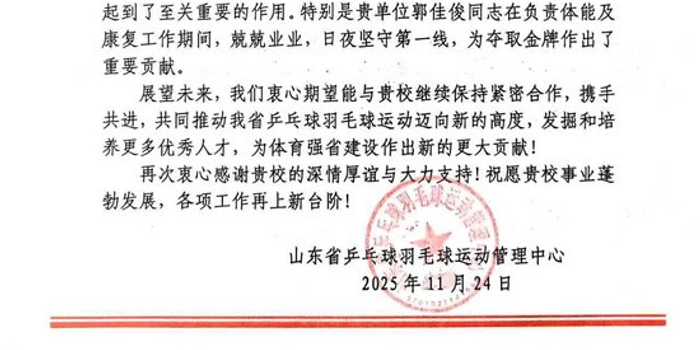 在第十五届全国运动会中,山东省乒乓球项目斩获成年组女子团体金牌、青年组女子团体银牌等多项佳绩。感谢信中特别提到,这份成绩的取得,离不开济宁学院在人才交流、科技服务、属地资源协调等方面的大力支持。特别是郭佳俊同学在备战关键阶段,以“兢兢业业、日夜坚守”的工作状态投身体能与康复保障,为队伍竞技水平提升和状态调整发挥了重要作用。
