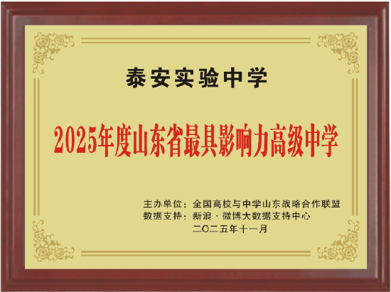 日前,2025年度山东教育盛典荣耀榜单盛大发布,泰安实验中学荣获“山东省最具影响力高级中学”奖项。