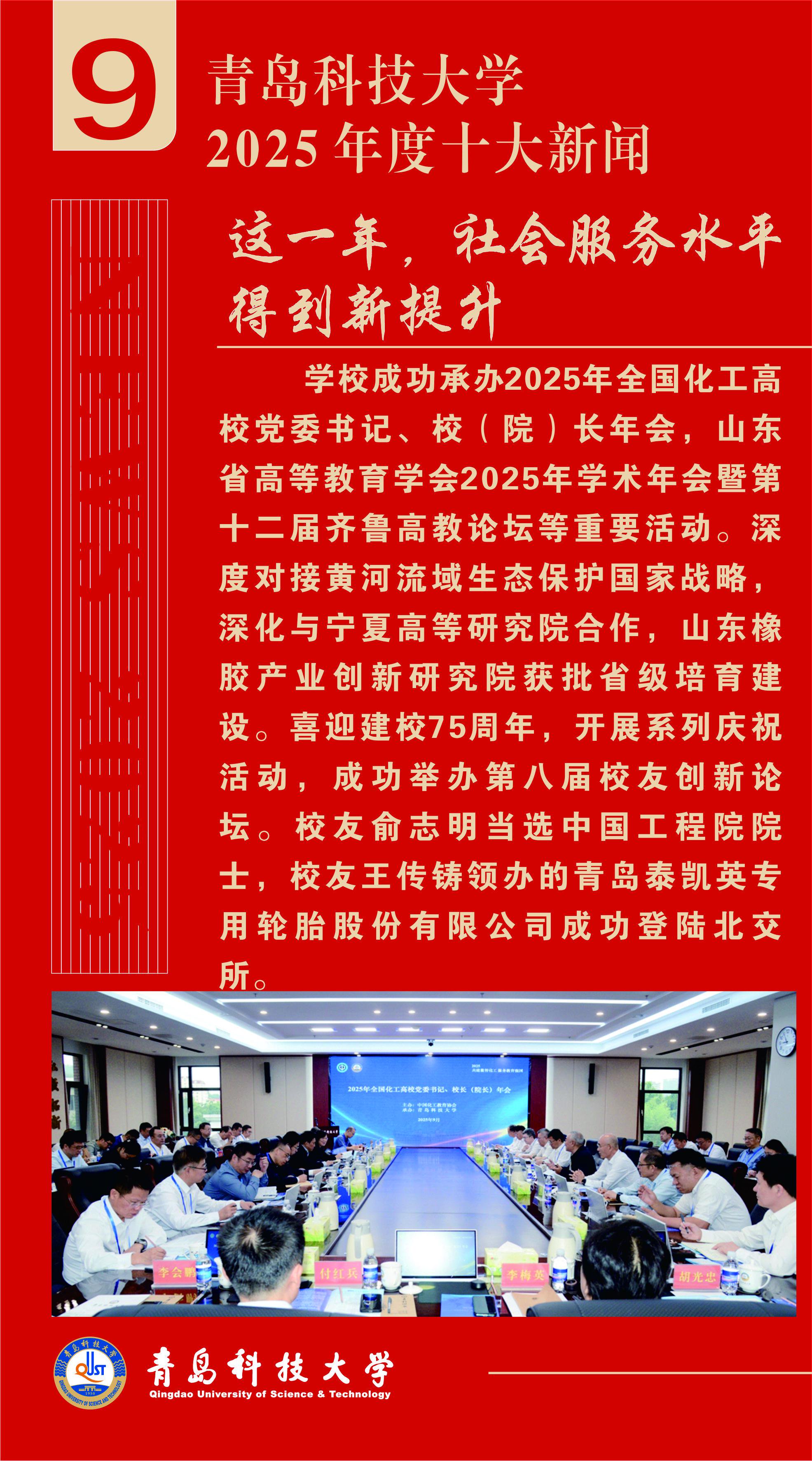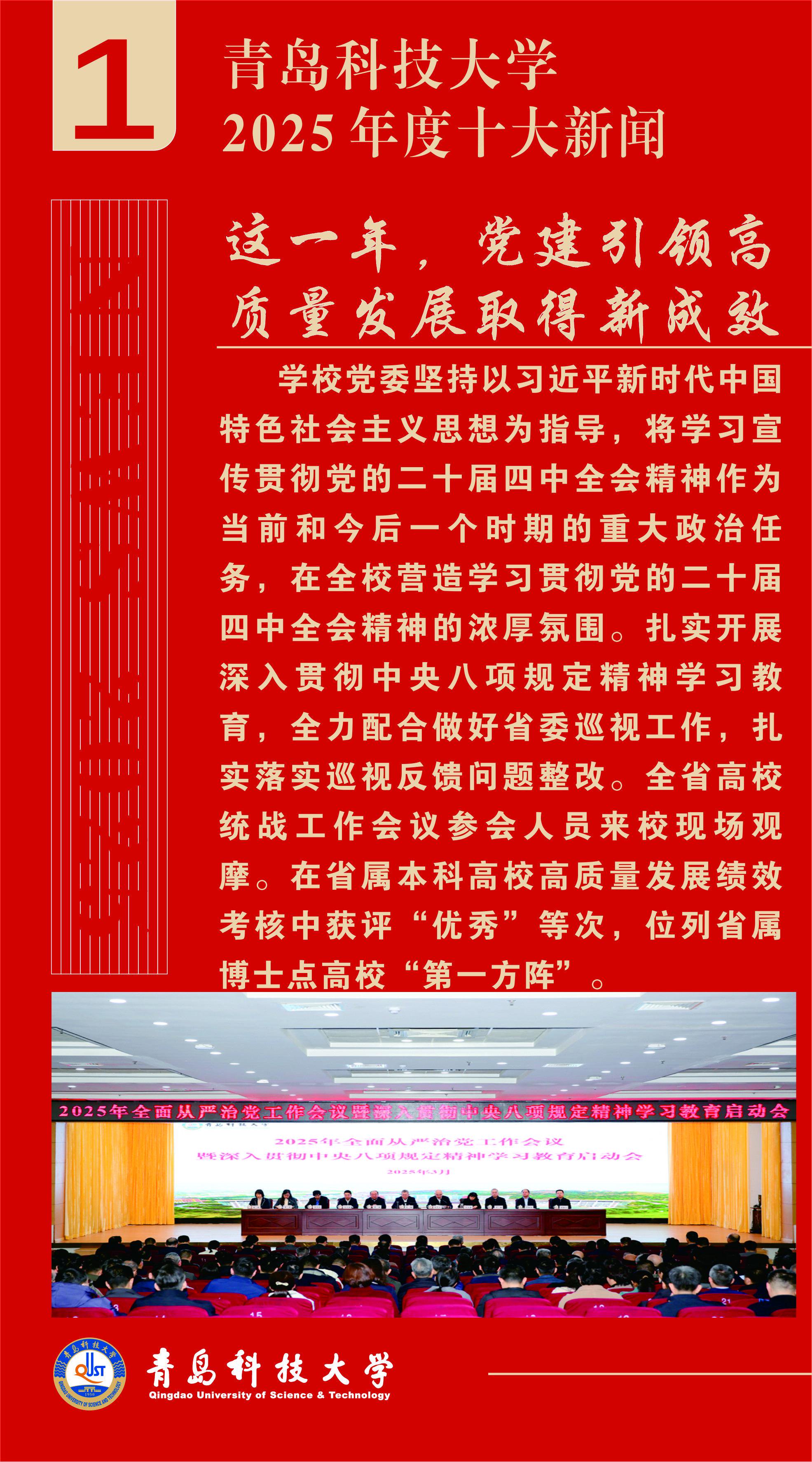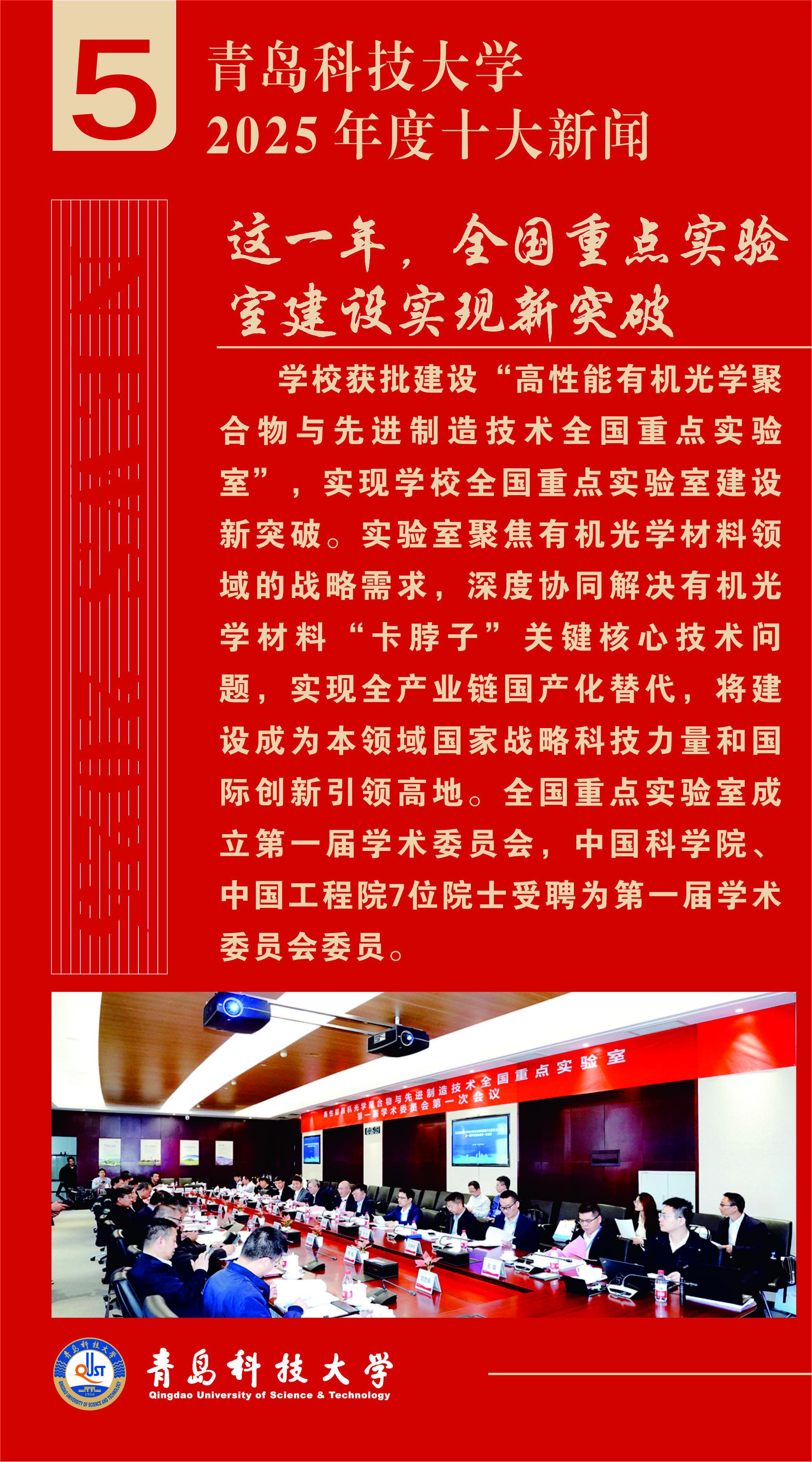 关注2025年是“十四五”规划决胜收官、“十五五”规划谋篇布局的重要一年。为集中宣传和展示青岛科技大学一年来的丰硕成果,彰显全体青科大人发扬“科大精神”、践行“橡胶品格”的精神风貌,进一步凝聚全校师生校友奋进力量,日前,由党委宣传部主办的“青岛科技大学2025年度十大新闻”评选活动圆满结束,经广大师生校友、网友投票和专家评议,“全国重点实验室建设实现新突破”等10条新闻入选“青岛科技大学2025年度十大新闻”。现将评选结果公布如下: