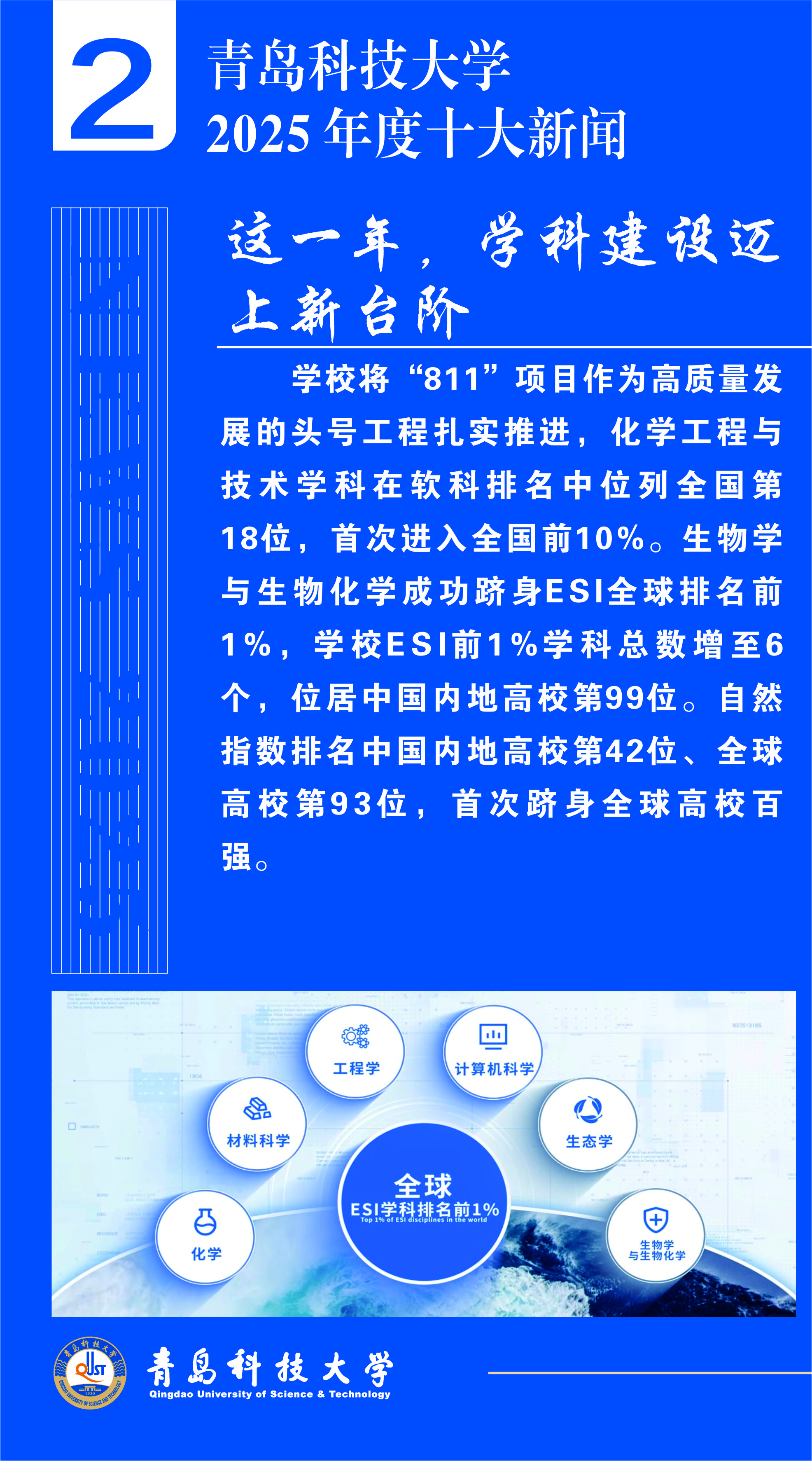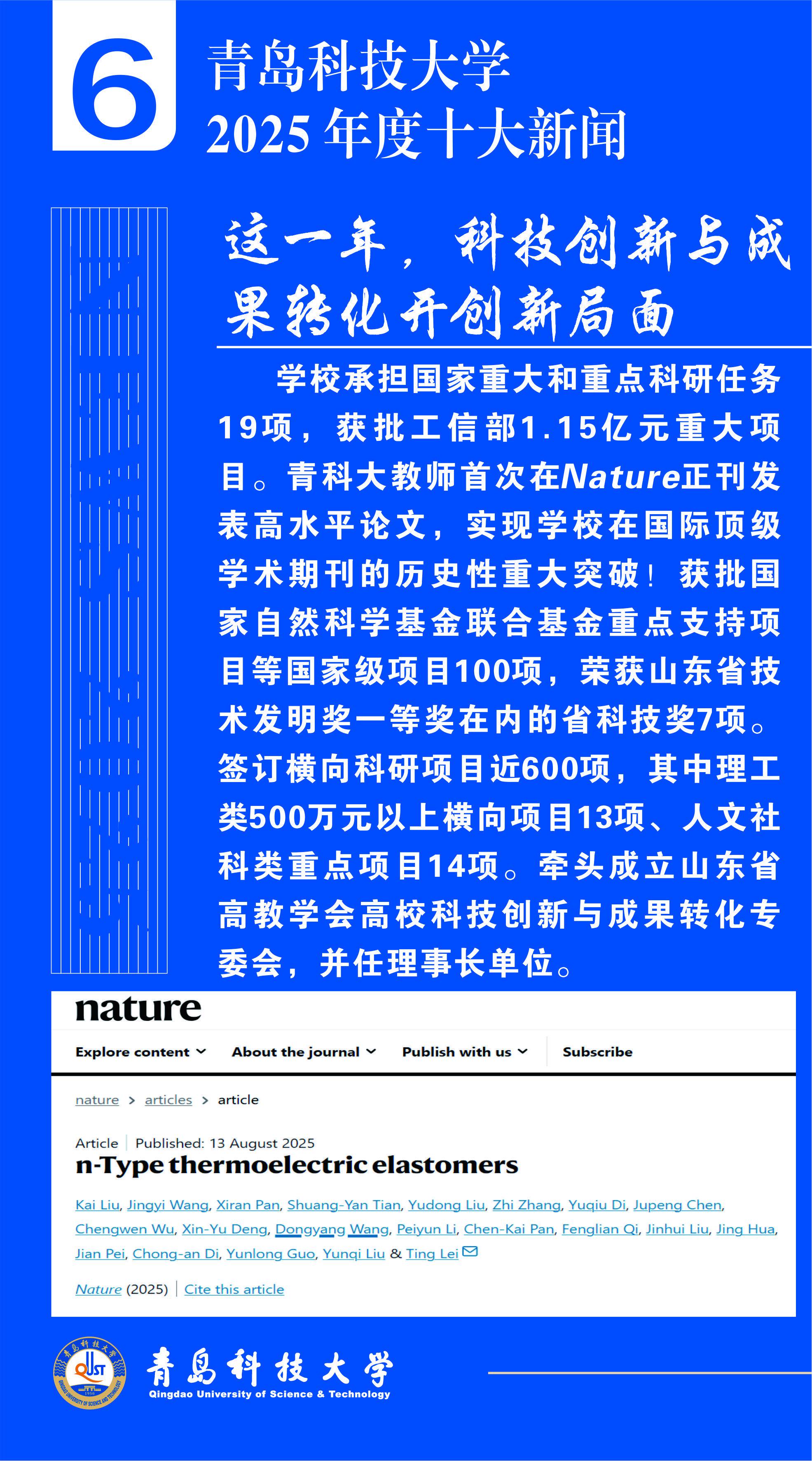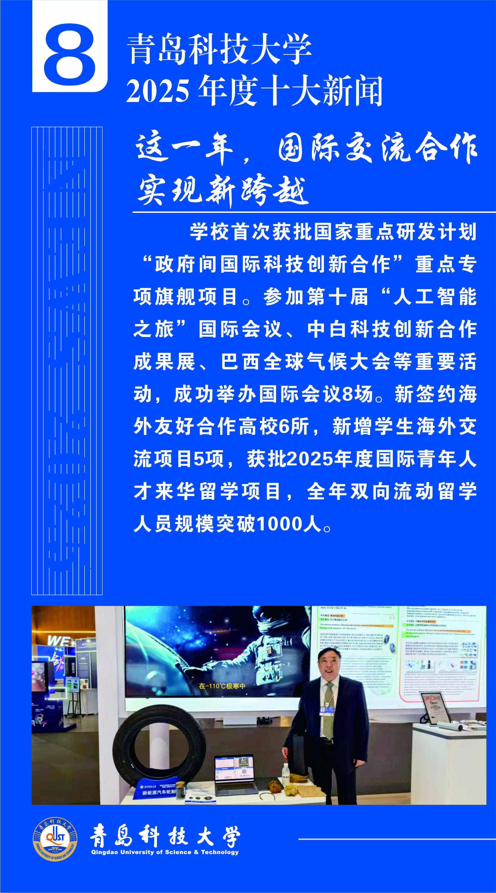 关注2025年是“十四五”规划决胜收官、“十五五”规划谋篇布局的重要一年。为集中宣传和展示青岛科技大学一年来的丰硕成果,彰显全体青科大人发扬“科大精神”、践行“橡胶品格”的精神风貌,进一步凝聚全校师生校友奋进力量,日前,由党委宣传部主办的“青岛科技大学2025年度十大新闻”评选活动圆满结束,经广大师生校友、网友投票和专家评议,“全国重点实验室建设实现新突破”等10条新闻入选“青岛科技大学2025年度十大新闻”。现将评选结果公布如下: