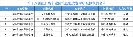 关注日前,山东省教育厅发布《关于第十八届山东省职业院校技能大赛拟获奖名单公示》。山东省济南商贸学校共有5支参赛队伍进入中职组获奖名单,荣获1枚金牌、4枚银牌。