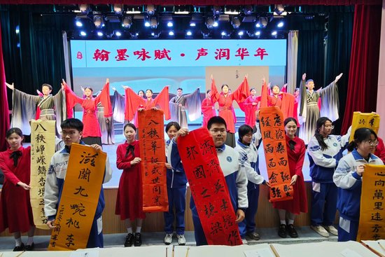 在“翰墨咏赋·声润华年”篇章中,高一“悦心”诵读社团与翰墨香书法社团联袂演绎的《济南中学八轶华诞赋》成为全场焦点。诵读与书写的完美交融,不仅展现了同学们扎实的技艺功底,更传递出对学校精神的深刻理解与真挚礼赞,赢得了满堂掌声,为活动奠定了庄重而昂扬的基调。
