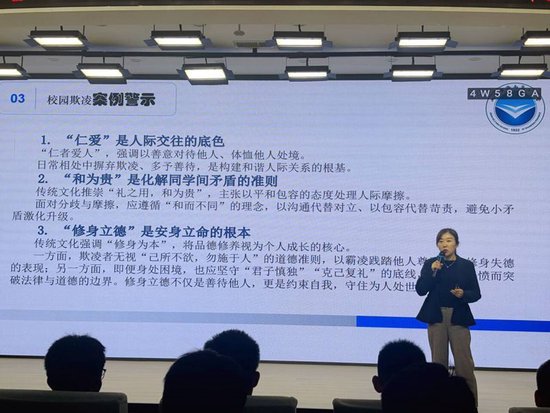 新《治安管理处罚法》强调“矫治教育”,本质与儒家“修身立德”理念相通 —— 欺凌者无视“己所不欲,勿施于人”的道德准则,既是违法也是失德;被欺凌者若能坚守“君子慎独”的底线,及时通过法律途径求助,而非以暴制暴,便能避免悲剧。为让同学们更易理解,他还引用《论语》中“君子和而不同”的观点,建议大家面对同学分歧时,以沟通代替对立、以包容代替苛责,“小矛盾若及时化解,便不会升级为欺凌”。现场同学纷纷表示,“原来法律不是冰冷的条文,还和我们学过的传统文化相通”。
