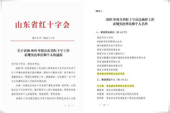 关注近日,山东省红十字会印发《关于表扬2025年度山东省红十字系统表现突出单位和个人的通报》(鲁红办字〔2025〕5号),青岛酒店管理职业技术学院荣获“全省红十字应急救护工作表现突出单位”称号,马文辉荣获“全省红十字应急救护工作表现突出个人”称号。