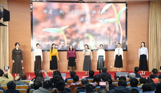 荣休仪式后,离退休老干部合唱团、师生代表表演了精彩的文艺节目。合唱《我的中国心》《革命人永远是年轻》,配乐诗朗诵《师者如光》,小合唱《长大后我就成了你》,男女声二重唱《我的深情为你守候》,充分表达了对荣休教职工的美好祝愿,赢得了阵阵掌声。