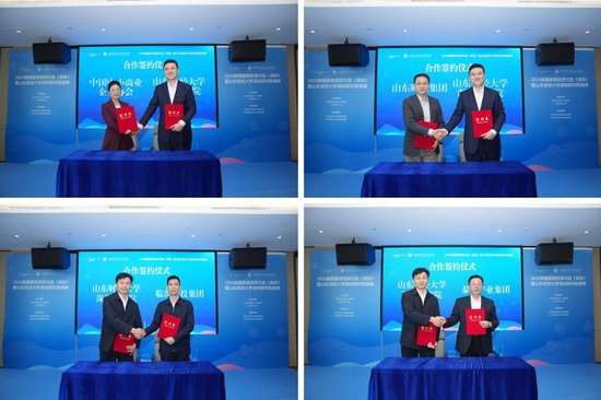 山东财经大学深圳研究院常务副院长张宝义与中国中小商业企业协会副秘书长余微,上海山财企业发展有限公司董事长李辉;合作发展处处长、研究院副院长徐彬与临沂城投集团党委书记、董事长王新华,泰安泰山产业发展投资集团党委书记、董事长武启军分别签署合作协议。