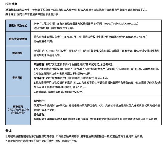 烟台南山学院2026年单独招生及综合评价招生简章