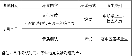 采取“文化素质+专业技能”的考试方式,总分为430分。其中,文化素质考试为200分,专业技能测试为230分,均以原始成绩计入总分。
