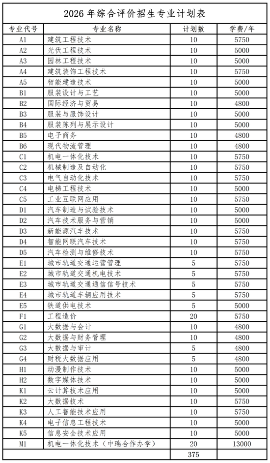 2026年安排单独考试招生(普通类)300人,单独考试招生(退役军人类)75人。综合评价招生375人。分专业招生计划请查看我校招生信息网(网址:https://zsbgs.jngcxy.edu.cn)。