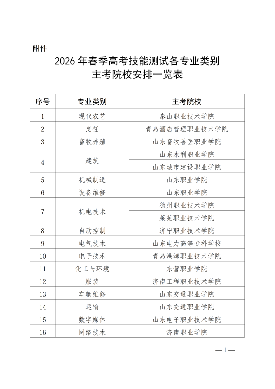 2026年春季高考技能测试各专业类别主考院校安排一览表