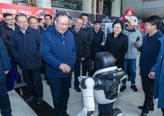 在学校展位前,省市有关领导观看了人形机器人、智能机器狗、数字人烟小博、植物染等展品展示,听取了学校在推动区域产业数智化升级、服务文旅融合发展等方面的汇报,对学校创新成果给予高度评价。