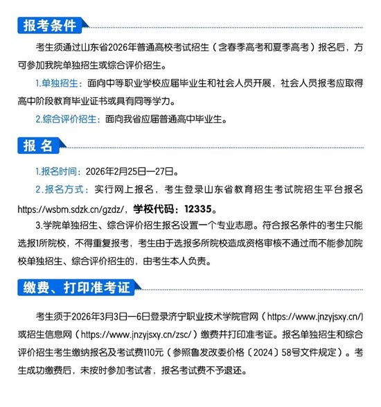 学校代码12335!济宁职业技术学院2026年单独招生和综合评价招生简章