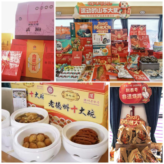 本次年货大集精选具有山东地域代表性的鲁菜精品与特色年货,将列车打造成移动的“鲁菜文化展厅”,引得众多旅客驻足品鉴、踊跃选购。现场参展阵容亮眼,既有山东胶东人家餐饮集团的向婆好礼,山东金御坊粮油股份公司的粮油产品,山东丝路灵岩旅游文化公司、济南市长清区一山茶农场的酸枣茶叶,吉庆源(山东)食品科技公司、黄河鱼谷的黄河鲤鱼,泰安市政阳餐饮管理公司的利泰号老李家非遗烧鸡等优质企业带来的特色产品;也有德州福临居餐饮管理公司的德州扒鸡、德州十大碗,微山湖旅游发展集团、山东永甲食品公司及微山县推出的微山湖大闸蟹、咸鸭蛋等家喻户晓的老字号与地理标志产品;还汇聚了各具风味的创新美食与手工艺品,品类丰富、品质上乘,让旅客在方寸车厢间阅尽齐鲁好品。各参展商家同步推出多重优惠让利举措,让旅客在品味鲁味鲜香、置办新春年货的同时,尽享实实在在的消费实惠。