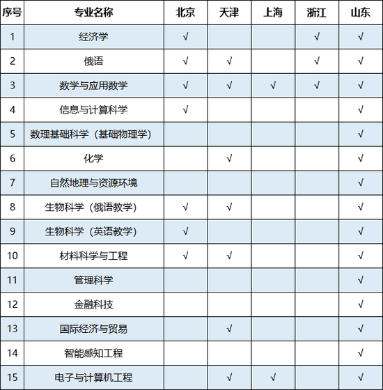 1。在北京、天津、上海、浙江、山东各省(直辖市)计划招生专业如下,表中“√”表示该省份有此招生专业。