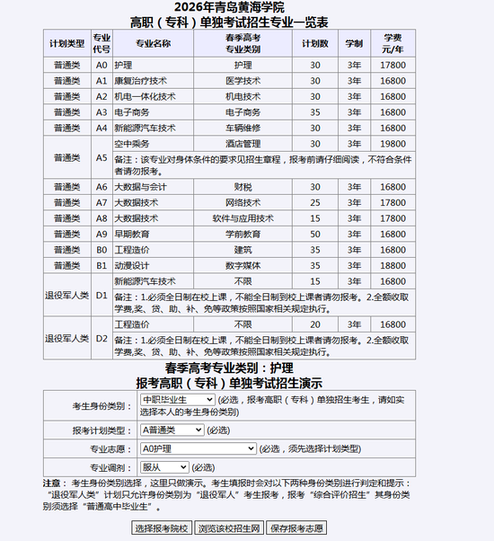(二)参加我校专科单独考试招生和综合评价招生的考生须于2026年2月25日—2月27日(每天9:00至18:00),登录省教育招生考试院招生平台(网址:https://wsbm.sdzk.cn/gzdz/)选报“青岛黄海学院”和专业。