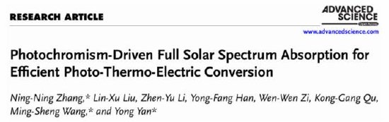 关注日前,聊城大学化学化工学院张宁宁博士、严勇博士联合中国科学院福建物质结构研究所王明盛研究员在国际顶尖学术期刊《Advanced Science》(先进科学)(中科院1区,IF = 14.1,DOI: 10.1002/advs.202518602)上发表了题为《Photochromism-Driven Full Solar Spectrum Absorption for Efficient Photo-Thermo-Electric Conversion》(光致变色驱动全太阳光谱吸收实现高效光-热-电转换)的研究论文。该研究首次将光致变色材料应用于光-热-电转换领域,成功开发出一种具有全光谱吸收能力的高性能有机光热材料,为太阳能高效捕获与转化提供了新策略。论文第一作者为张宁宁博士,第一署名单位为聊城大学。