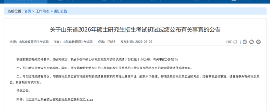 关注2月26日,山东省教育招生考试院发布《关于山东省2026年硕士研究生招生考试初试成绩公布有关事宜的公告》,我省2026年硕士研究生招生考试初试成绩于2月28日8:00公布。具体内容跟小编一起来看——