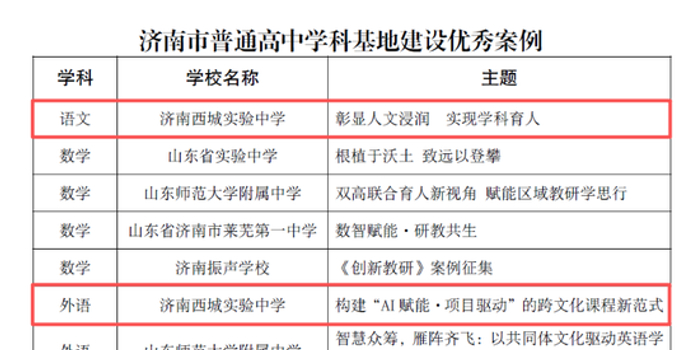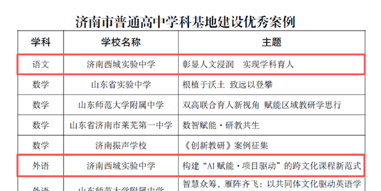 会上,《汇智·拓新:济南市高中“学科基地+新备课组”实践精粹》正式公布收录案例名单,济南西城实验中学语文学科基地申报的《彰显人文浸润 实现学科育人》案例和英语学科基地申报的《构建“AI赋能·项目驱动”的跨文化课程新范式》案例,凭借扎实的实践成效、鲜明的创新特色和突出的育人价值,成功入选优秀案例,充分彰显了我校在学科基地建设与“新备课组”改革中的扎实探索与丰硕成果。济南西城实验中学将以此次荣誉为新起点,深入总结学科基地建设与“新备课组”改革的实践经验,深化案例成果的提炼与推广,推动各学科协同发展,擦亮学科建设品牌,为济南高中教育高质量发展贡献西城力量。
