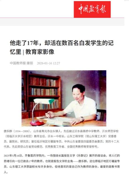 在此之前,2025年5月16日,由山东立德树人学会、山东省沂蒙文化研究会、齐鲁医药学院与山东理工大学共同主办的长篇报告文学《乐群记》座谈会在齐鲁医药学院成功举行,座谈会的召开旨在弘扬沂蒙精神、传承红色基因,“让唐乐群同志教书育人精神融入立德树人事业之中”,聚焦教育领域先进人物事迹,推动立德树人事业与优秀传统文化深度融合。