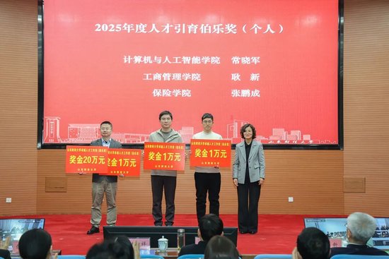 纪委书记、监察专员王玉花为计算机与人工智能学院常晓军、工商管理学院耿新、保险学院张鹏成颁发人才引育伯乐奖。