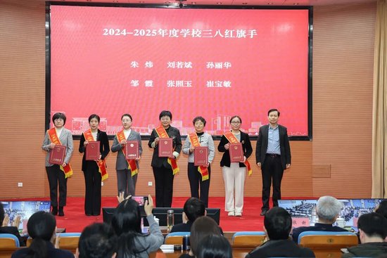 学术副校长吴德胜为三八红旗手颁奖。朱炜、刘若斌、孙丽华、邹霞、张照玉、崔宝敏上台领奖。