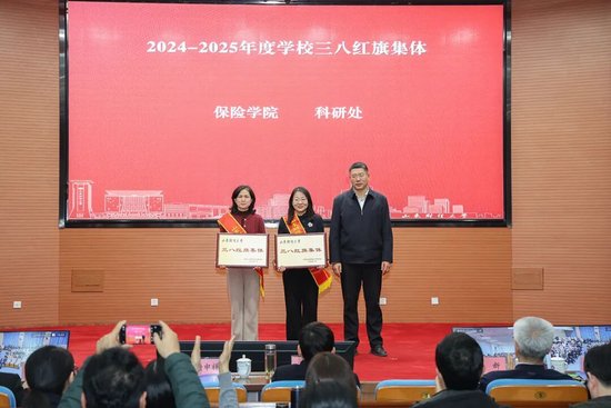 副校长刘旻航为三八红旗集体——保险学院、科研处颁奖。