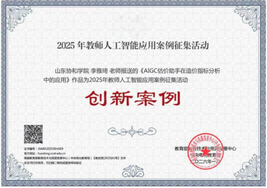 关注日前,教育部教育技术与资源发展中心(中央电化教育馆)公布2025年教师人工智能应用案例征集活动评选结果,山东协和学院李雅琦老师报送的《AIGC估价助手在造价指标分析中的应用》案例,凭借在人工智能与专业教学深度融合方面的创新探索,成功获评“创新案例”,展现了学校在教育数字化转型与智能教学应用领域的扎实成果。