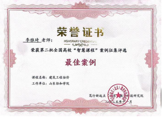 关注日前,第二批全国高校“智慧课程”案例征集评选结果正式公布,山东协和学院李雅琦老师牵头建设的《建筑工程估价》课程,凭借在智慧教学模式创新、数字化资源赋能专业教学等方面的突出实践,成功获评最佳案例,为学校智慧课程建设再添标志性成果。