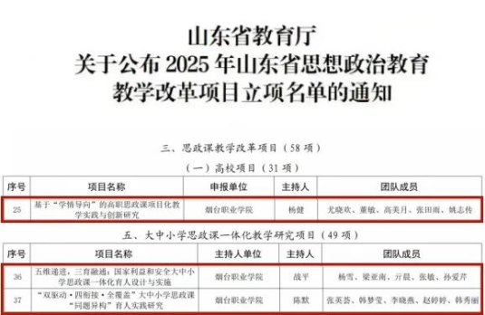 关注日前,山东省教育厅公布了2025年度山东省思想政治教育教学改革项目立项名单,烟台职业学院3个项目榜上有名。