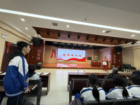 演讲结束后,现场开启“冠军面对面”互动环节,同学们踊跃提问,围绕备考压力、坚持动力、心态调整等问题与冠军深入交流。杨哲耐心解答,用亲身经历为学子们冲刺学考指点迷津,朴实的话语传递出直击人心的力量。