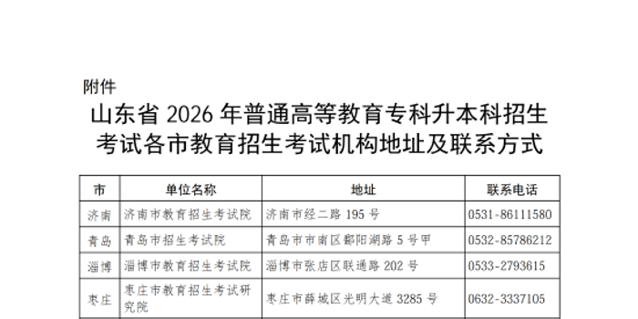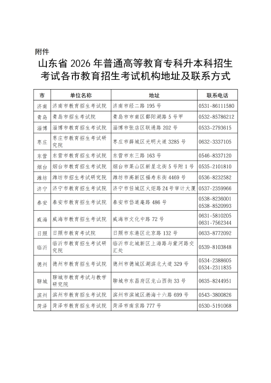 附件:山东省2026年普通高等教育专科升本科招生考试各市教育招生考试机构地址及联系方式