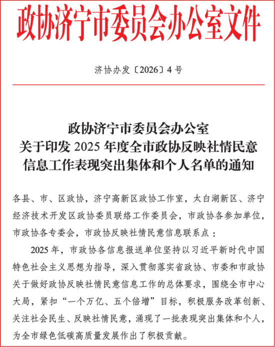 关注3月25日,政协济宁市委员会办公室发布《关于印发2025年度全市政协反映社情民意信息工作表现突出集体和个人名单的通知》。济宁学院凭借在服务改革创新、关注社会民生方面的突出贡献,荣获“表现突出集体”,济宁市政协委员、民盟济宁学院支部主委、济宁学院人文与传播学院教授赵双花荣获“表现突出个人”。