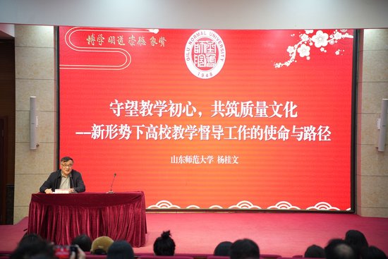 会议特邀山东师范大学教学督导委员会主任委员杨桂文教授作专题报告,报告以“守望教学初心,共筑质量文化——新形势下高校教学督导工作的使命与路径”为主题,围绕督导理念建设、督导方法与路径、督导工作如何深度融入学校发展等三个方面系统展开,为齐鲁师范学院教学督导工作提质增效提供了坚实的理论指导与宝贵的实践借鉴。