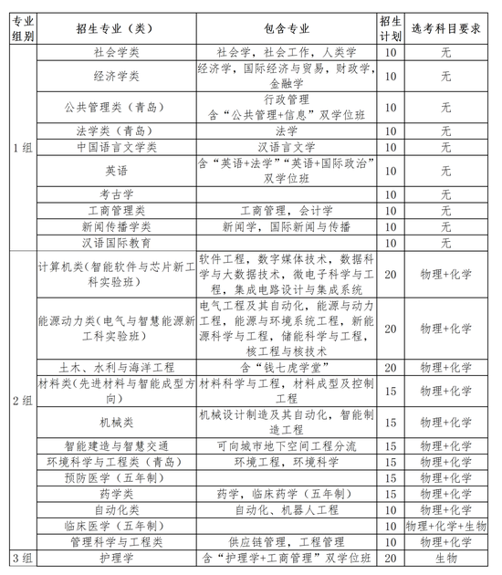注1:考生只能报考其中一个组别的专业,最多可报6个专业志愿,并可选择是否服从专业调剂(同组内调剂);根据生源情况,各专业招生计划可适当调整;最终招生专业及计划以山东省教育招生考试院公布为准。