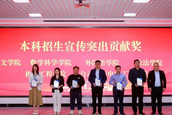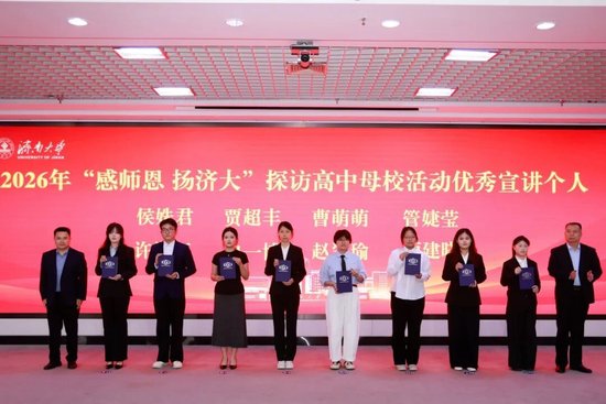 随后,学院代表、“大咖说”报告主讲教师代表、“感师恩 扬济大”优秀回访学子代表依次发言,结合自身实践分享宣传经验与感悟,传递了师生协同、助力招生的责任与担当,进一步凝聚全员参与、共促招生的强大共识。大会还对2025年度招生宣传先进单位、回访母校活动优秀团队及个人予以表彰,以先进典型引领示范,激发全员干事奋进热情。