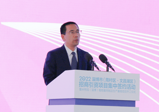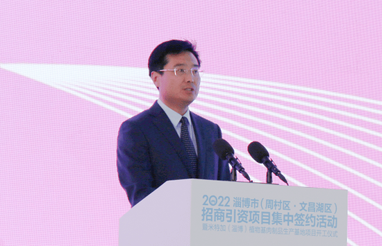 副市长李俊杰在致辞中说,近年来,淄博市聚力深化产业赋能,按照“紧盯前沿、打造生态、沿链聚合、集群发展”的产业组织理念,扎实做好“优存量”“扩增量”两篇文章,以平台思维、生态思维链接优质要素资源,深入推进“六个一”招引新机制,不断导入新业态、打造新组合、拥抱新变量,全市经济社会高质量发展迈出坚实步伐。本次集中签约的30个招商引资项目,涵盖了装备制造、大数据、新能源、服务业等重点领域,完全符合我市产业体系和发展布局,特别是米特加(淄博)植物基肉制品生产基地项目,是我市大力发展预制菜产业的重要支撑,将为预制菜未来市场开拓发挥示范引领作用。这些重大项目的成功签约,必将进一步发展新经济、开拓新赛道、构建新生态,为加快推动高质量发展注入强劲动力。